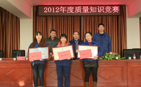 本次質(zhì)量知識競賽活動在公司領(lǐng)導(dǎo)的高度重視和舉辦部門的努力策劃下,共有8個參賽代表隊和100多名員工參加比賽,知識競賽活動分五輪進行(分別為個人必答環(huán)節(jié),集體必答環(huán)節(jié),現(xiàn)場互動環(huán)節(jié),搶答環(huán)節(jié),風(fēng)險環(huán)節(jié))。經(jīng)過三個多小時的緊張角逐,最終102車間代表隊和質(zhì)量保證部代表隊獲得了分別獲得了表彰獎勵。競賽活動結(jié)束時,公司總經(jīng)理陳德剛、副總經(jīng)理高勇、生產(chǎn)副總監(jiān)王智等領(lǐng)導(dǎo)向獲得表彰獎勵的代表隊頒發(fā)了獎勵。